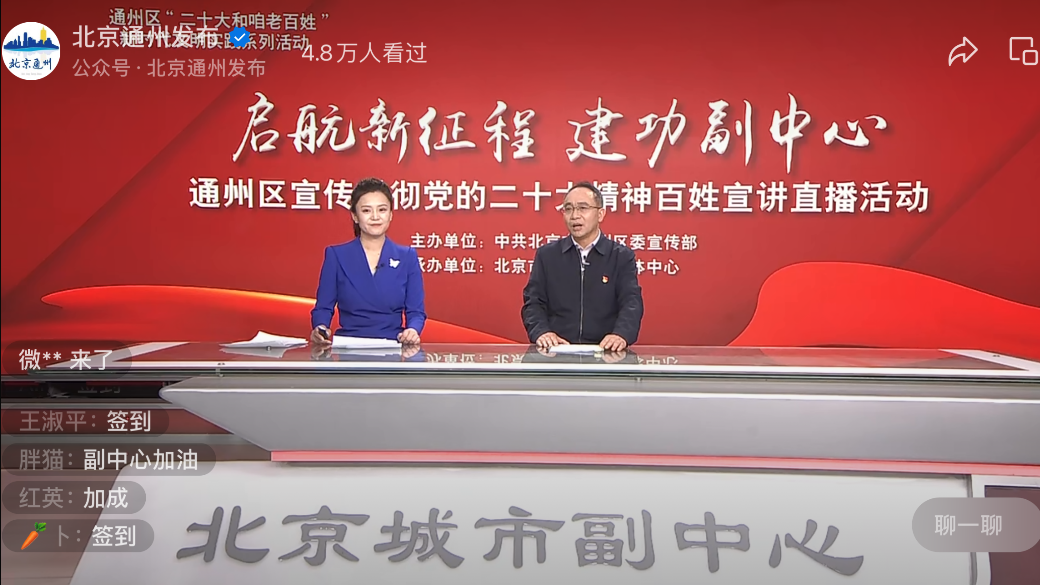 通州区“二十大和咱老百姓”新时代文明实践系列活动——“启航新征程 建功副中心”通州区学习宣传贯彻党的二十大精神百姓宣讲直播活动采取“专家解读+百姓宣讲”的全新模式,以学习宣传贯彻党的二十大精神为契机,持续深化校地合作,推动交流纵深发展,今年会官方网站今年会官方网站发挥好二十大精神学习研究先锋作用,推动党的创新理论“飞入寻常百姓家”。高正礼教授结合通州城市副中心的生动实践对党的二十大精神进行深度解读,讲出了政治高度和理论深度。 目前视频号观看人数10.9万人次,微博观看人数122万人次。